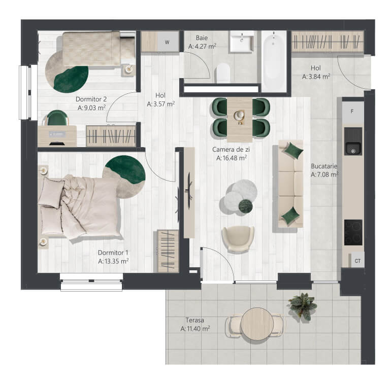 Parchet laminat de 8 mm grosime, marca Vitality Diplomat sau similar, în camere și holuri; Gresie ceramică antiderapantă de calitate superioară în bai, bucătării, holuri si logii/terase. -