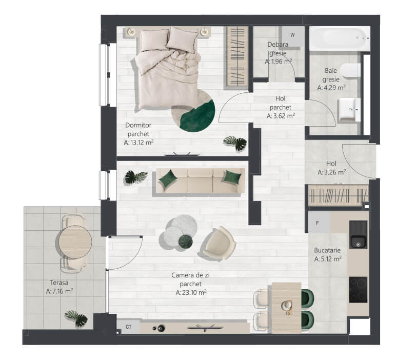 Parchet laminat de 8 mm grosime, marca Vitality Diplomat sau similar, în camere și holuri; Gresie ceramică antiderapantă de calitate superioară în bai, bucătării, holuri si logii/terase. -