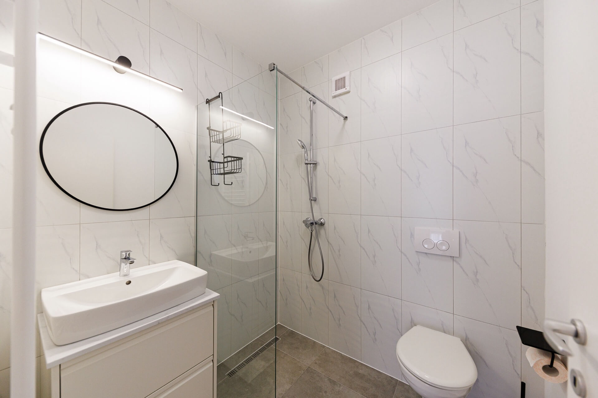 Băi complet echipate cu obiecte sanitare şi accesorii/ baterii (lavoare, vase WC, căzi de baie și cabine de duș) furnizate de Romstal sau similar; a doua baie din apartamentele de 3 camere este dotată cu cabina de duș.