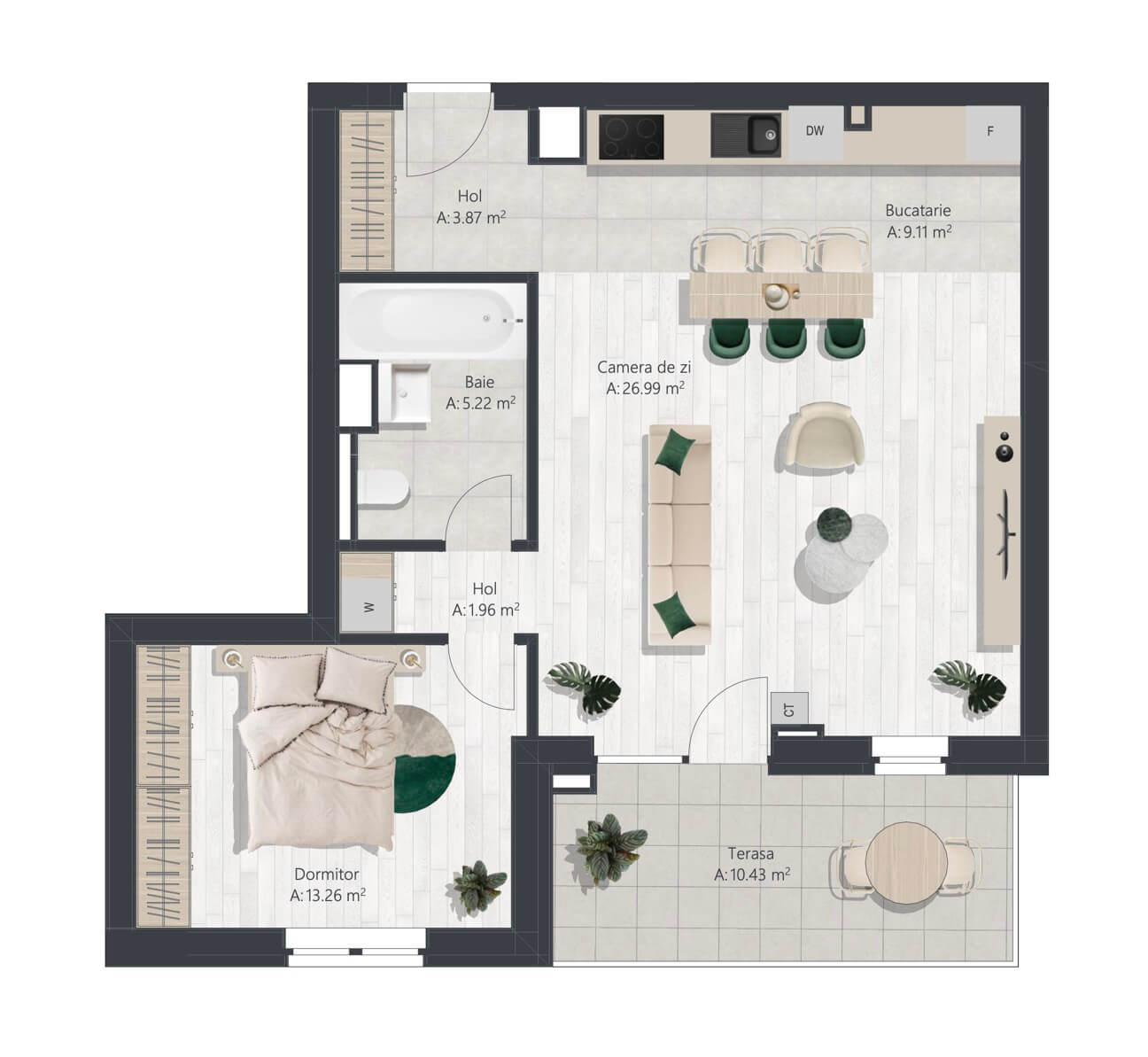 - Suprafaţă living: 26.99 mp